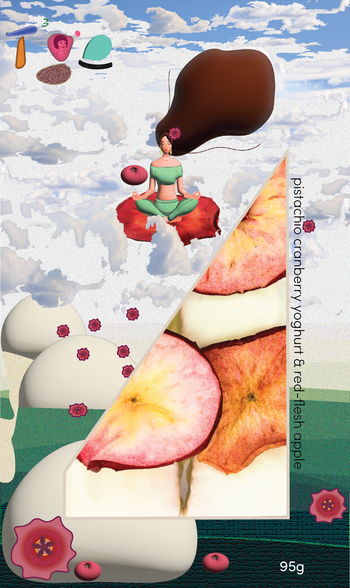 Australian grown dehydrated red fleshed apple with cranberry and pistachio in coconut coated with yoghurt. Generous cubes of confectionery with 5-6 slices of red fleshed apple. Aussie grown red fleshed apple is curated from South Australian grown and process resources (The Adelaide Hills). While the apple is very pretty, it is also high in anti-oxidants. It is therefore non-browning and no treatment is required to retain the colour through the drying process. The apple is tangy and “bright” on the palate. It pairs beautifully with the sweetness of the confectionery.